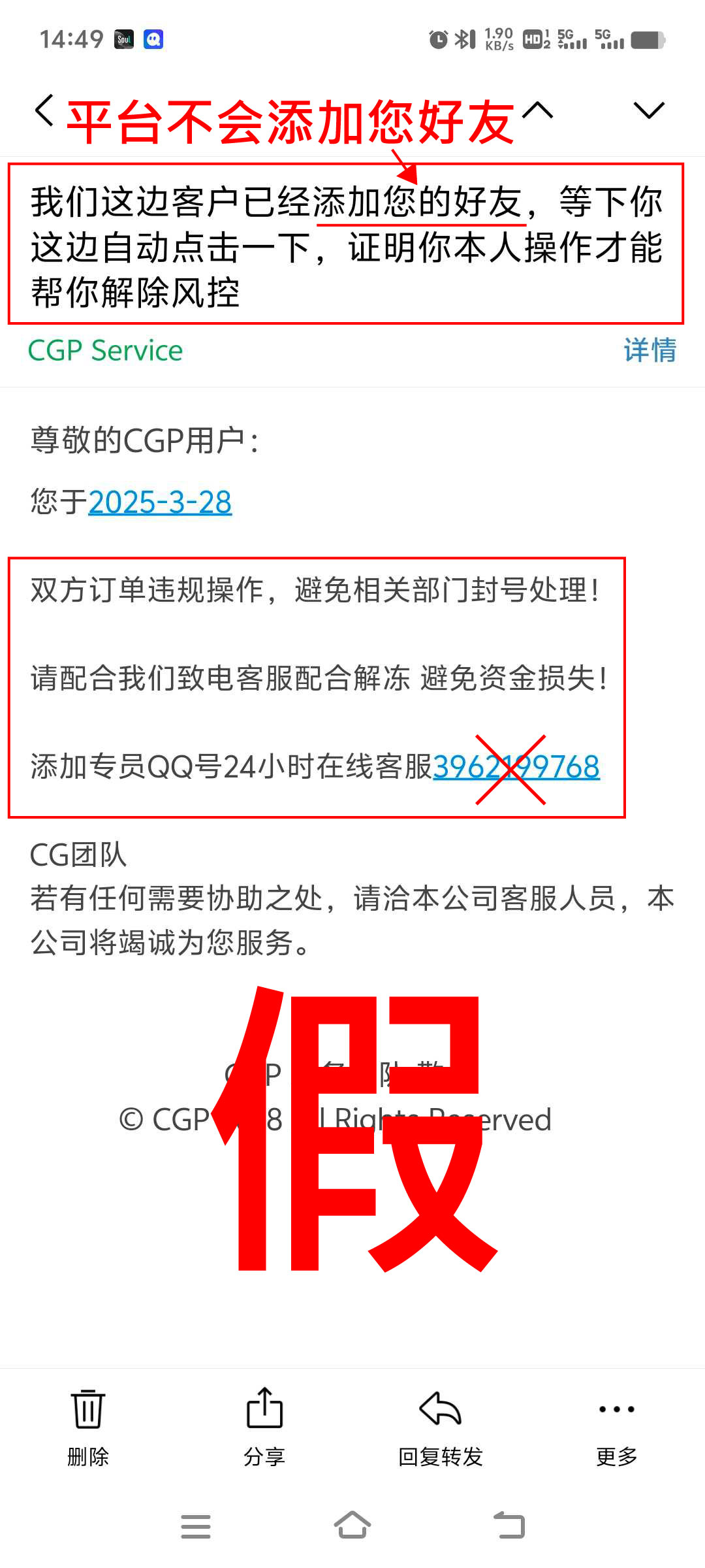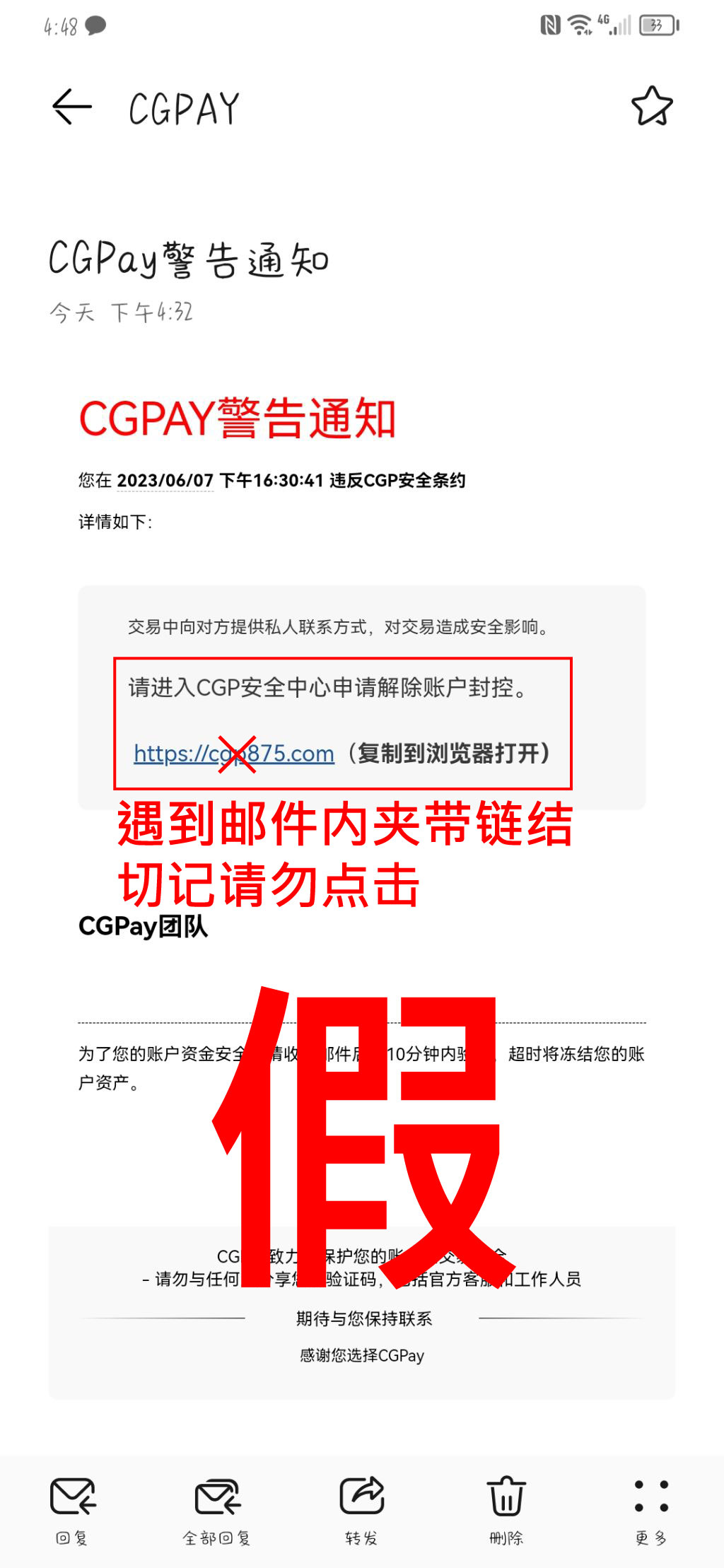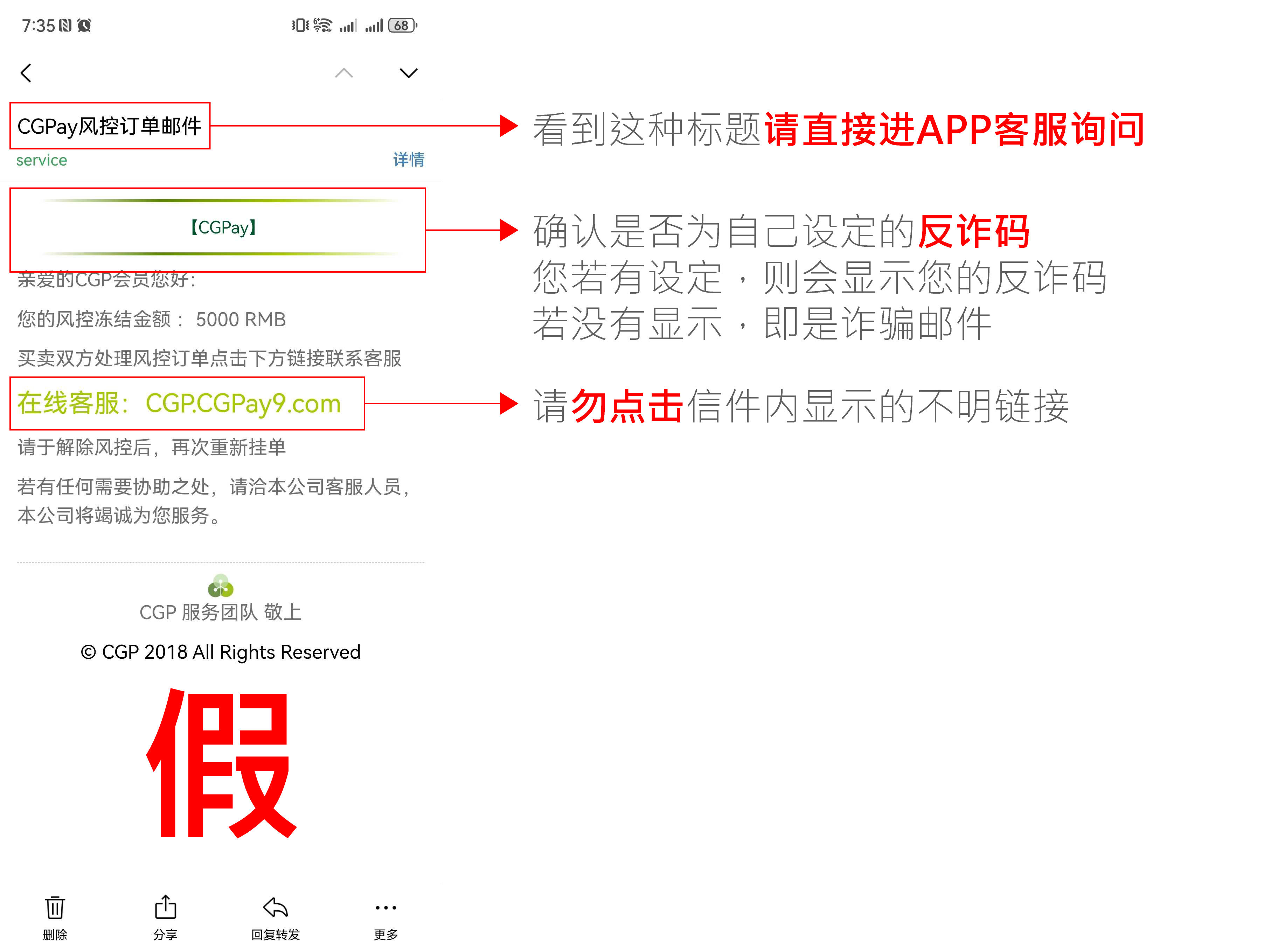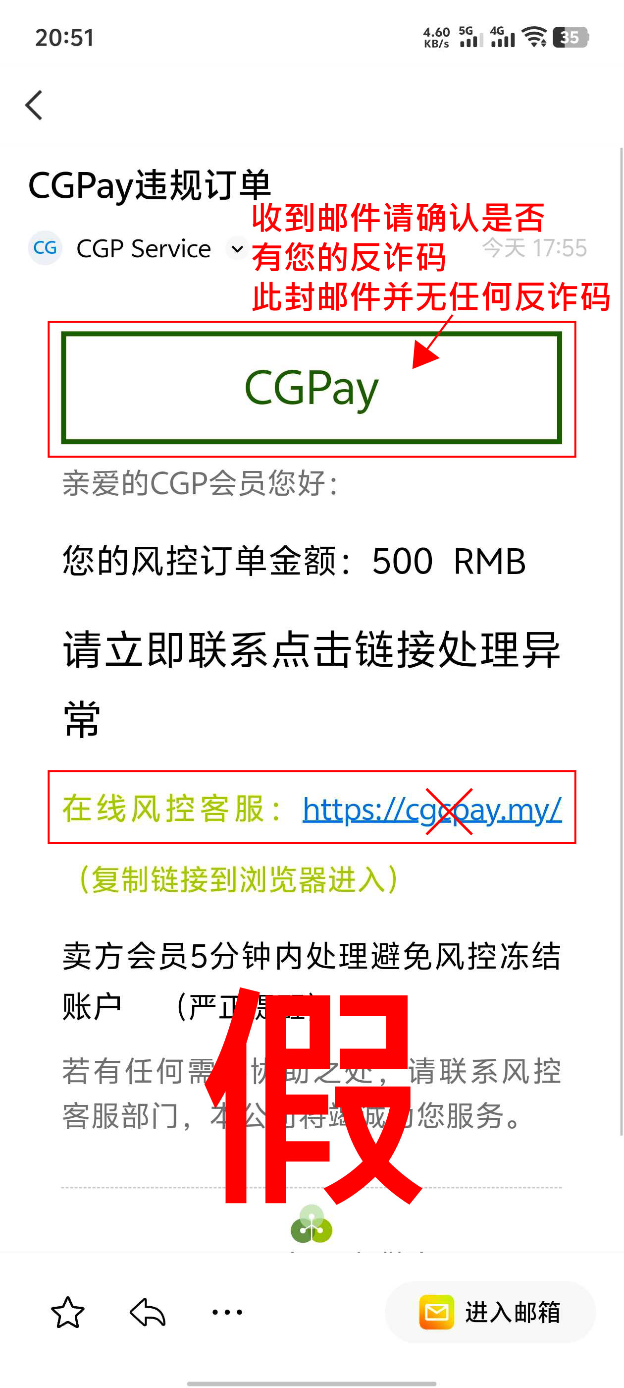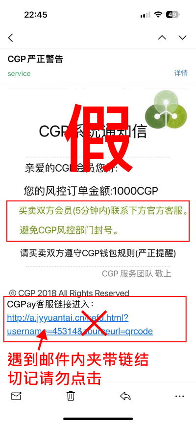 CGPay不会主动寄出「风控订单」、「严正警告」、「警告通知」、「订单异常」、「交易违规」、「资金冻结」等字眼为标题的邮件给会员,也不会要求您主动点击客服链接,点击此类恶意链接后,您有可能会被导入假客服或假安全中心进行诈骗。