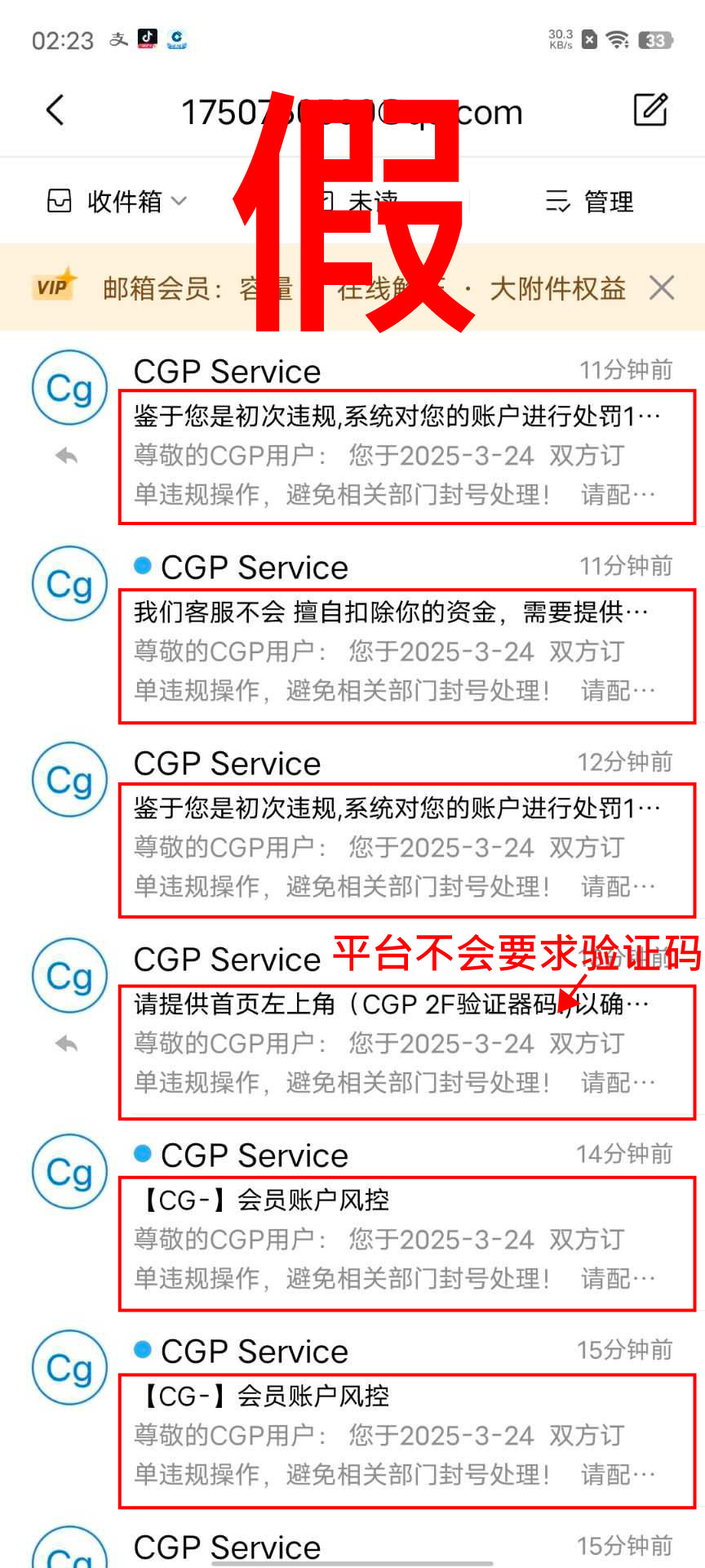 骗子常见套路,透过钓鱼邮件夹带恶意(假)链接,以假冒平台的方式发出警告邮件给会员,迫使会员基于恐惧忧虑而信以为真。利用这种恐惧来窃取会员的登入邮箱、手机号、身份证号、安全防护码、CG Auth验证器(2FA验证)等敏感信息,进而盗用上分,将您的资金全数骗光再也找不回来。