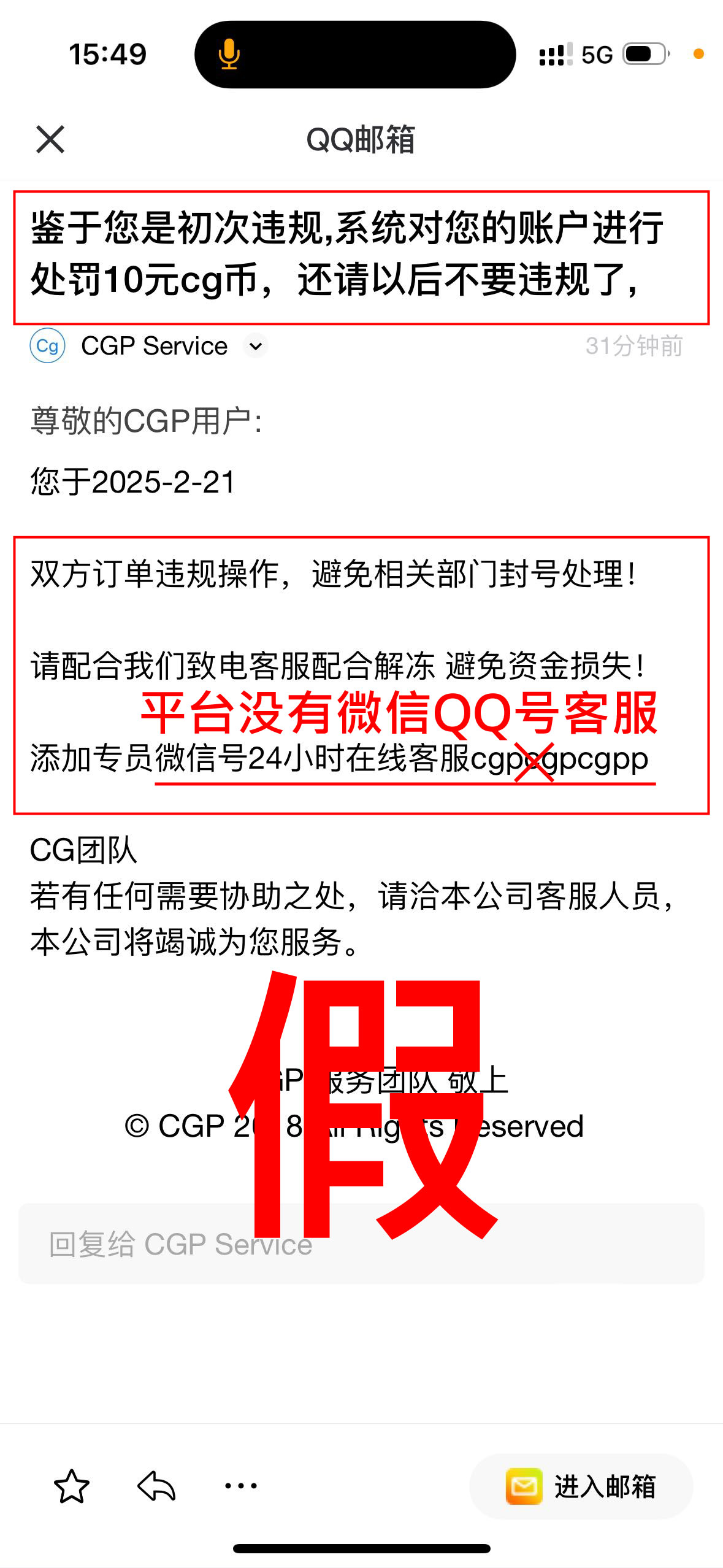 红框内皆为诈骗常用话术,收到此类邮件请勿相信,请直接进APP客服询问。