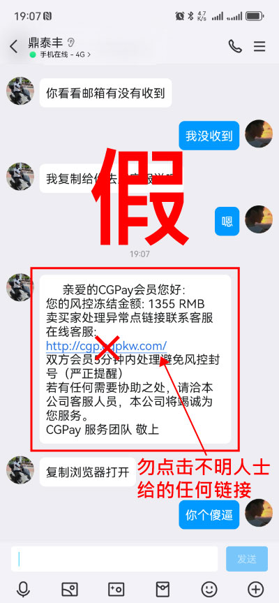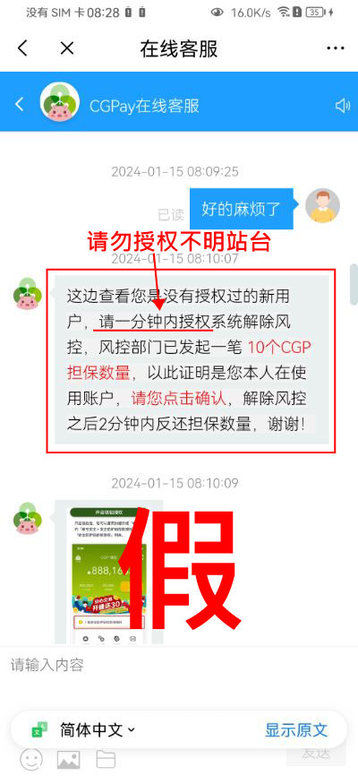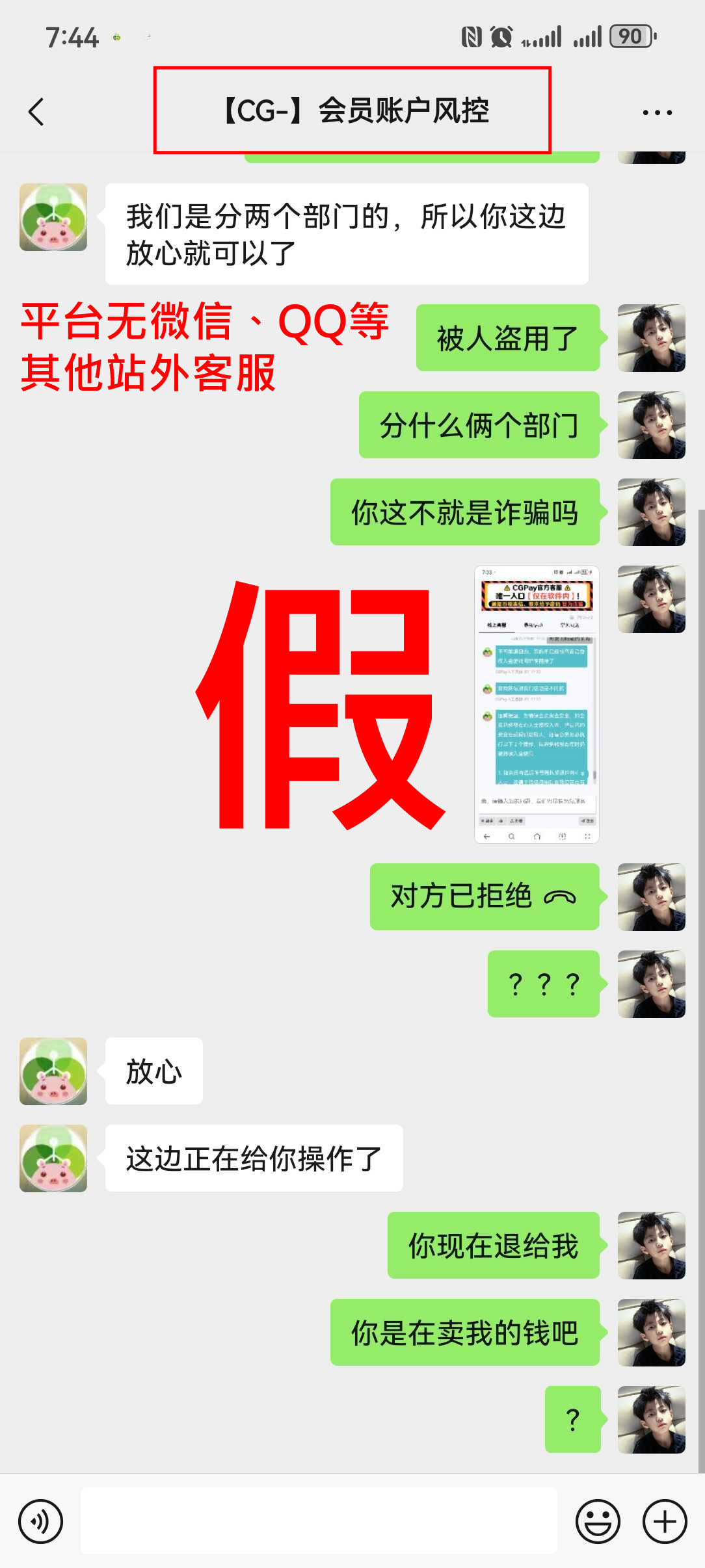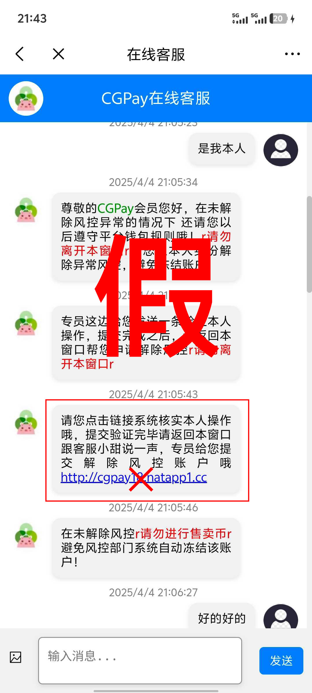 「假CGPay客服链接」给会员,要您去找假客服解锁,待会员联系到假客服时,会误以为是真的官方客服,并听信其解锁流程,直到被骗扫码上分完成,此时用户的资金正式流失。