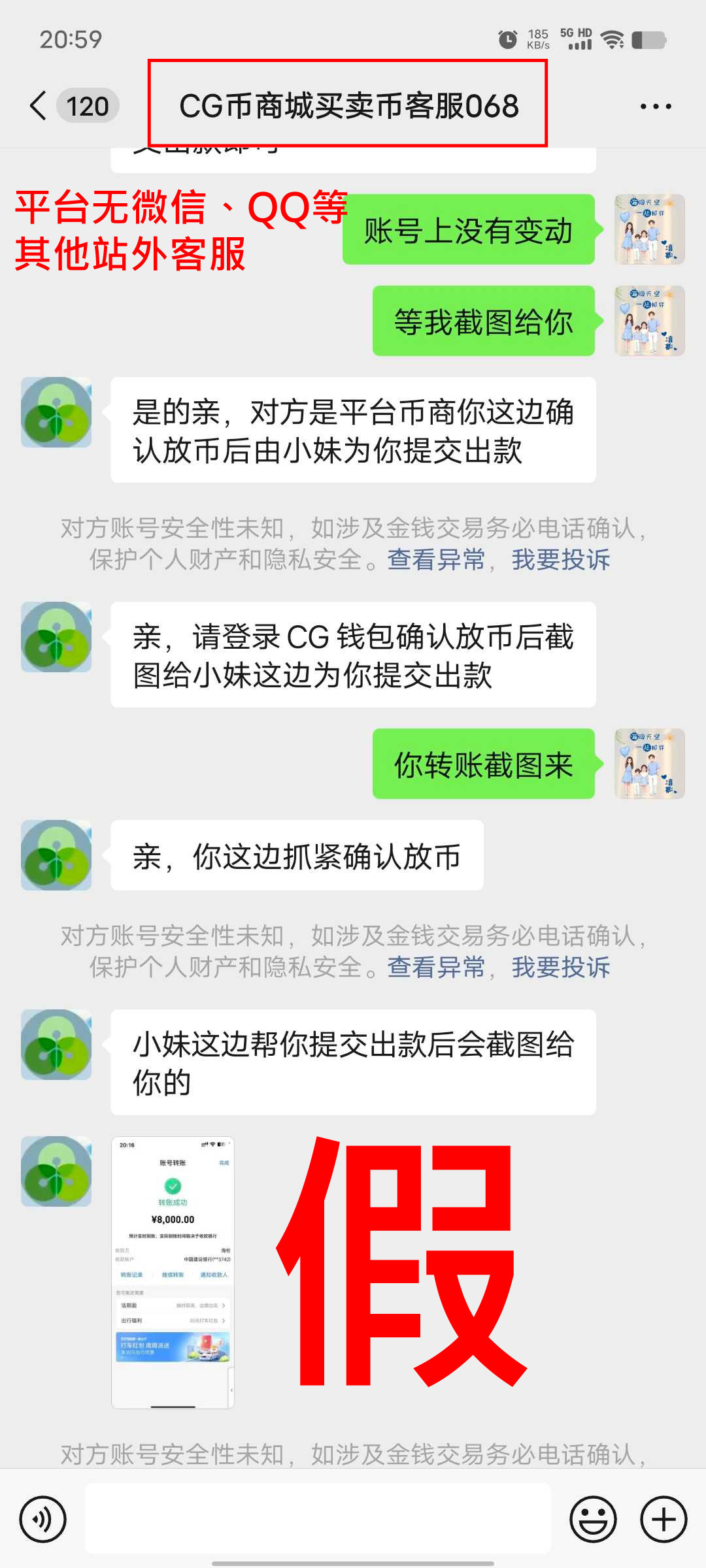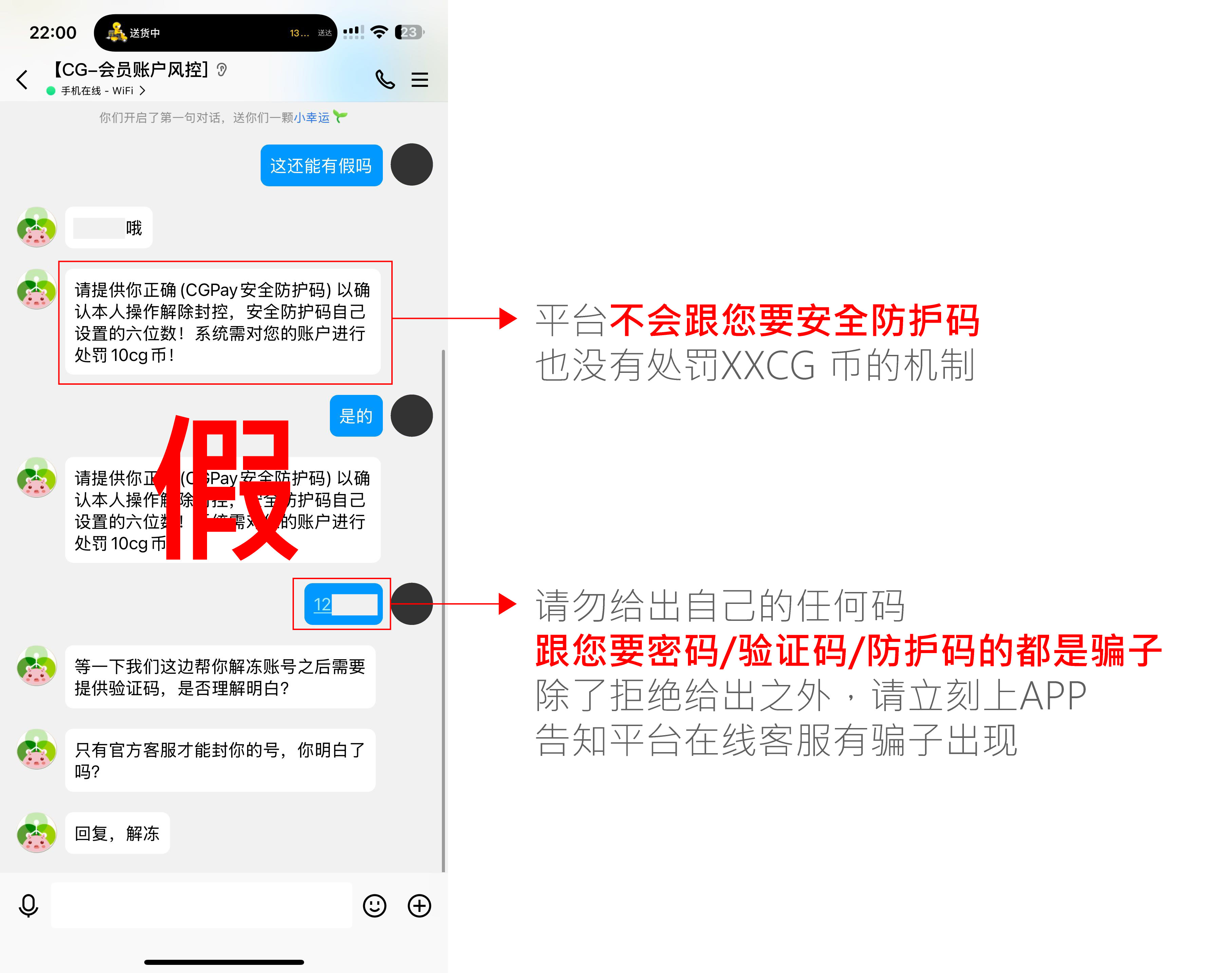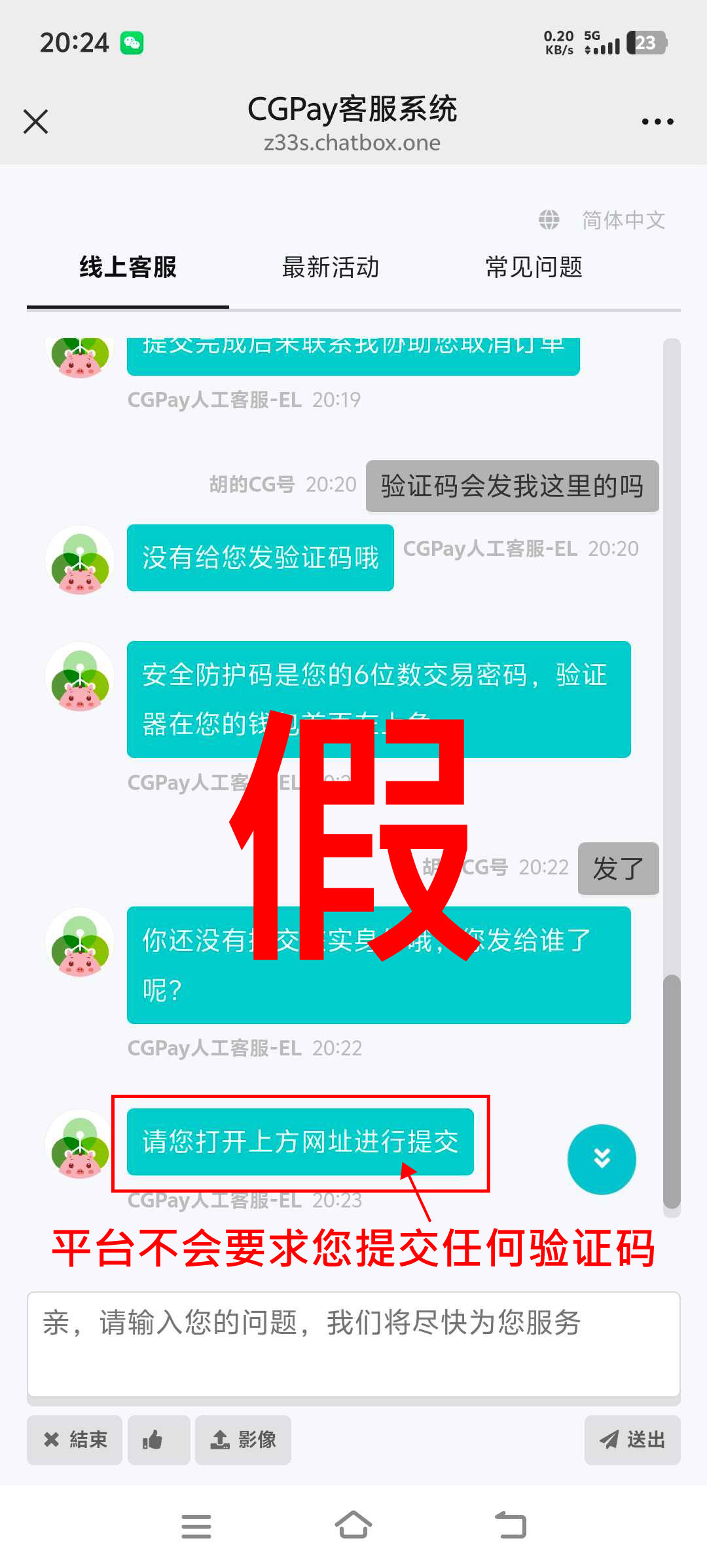 以上皆是常见的假客服、真盗分情境,看到勿慌,请直接打开APP联系在线客服进行确认,CGPay不会私下利用微信、QQ、支付宝客服、邮件给您不明链接或是二维码给您扫描!更不会要求您提供保证金、安全防护码、CG Auth验证器(2FA验证)等个人资料!请谨记,若私下进行交易与对话,平台是无法帮您进行追溯及取回您的款项!