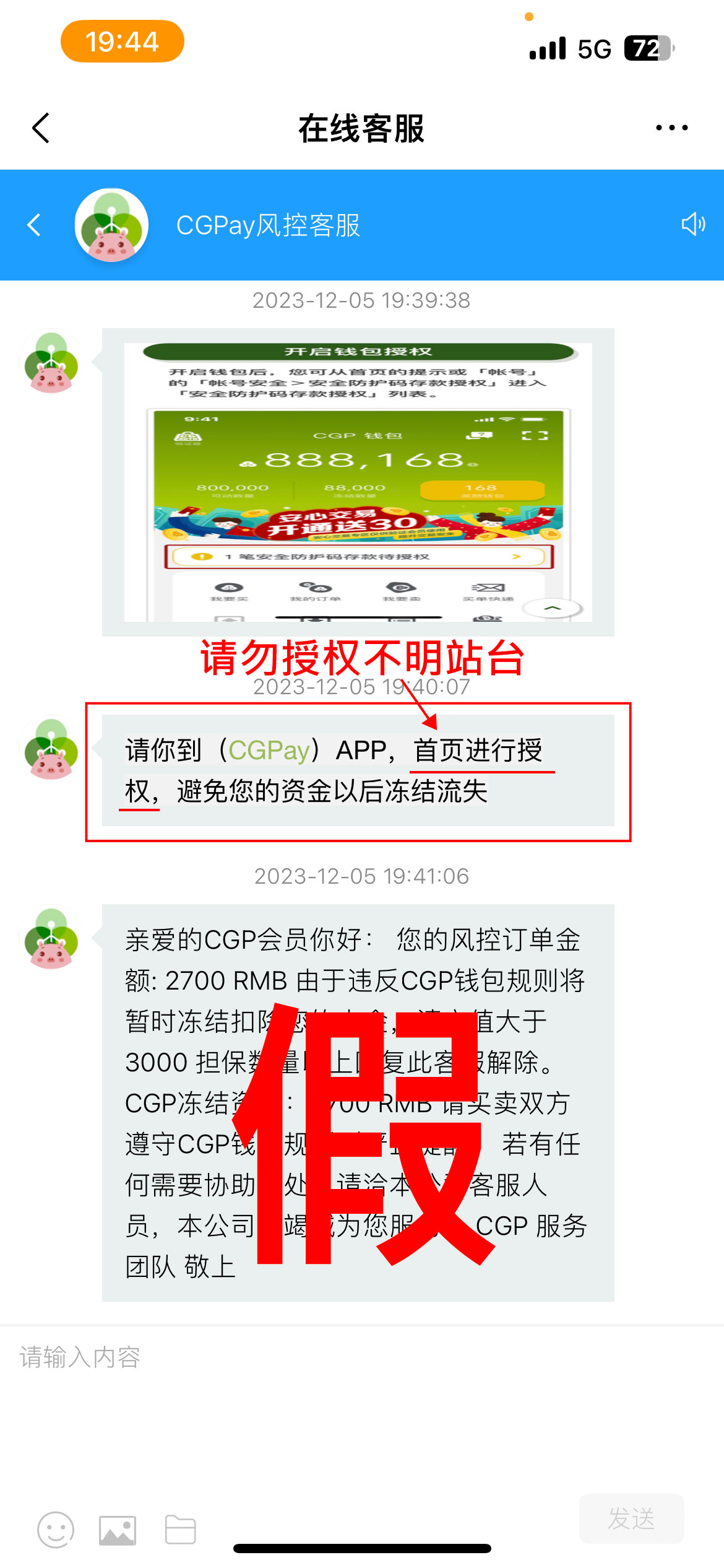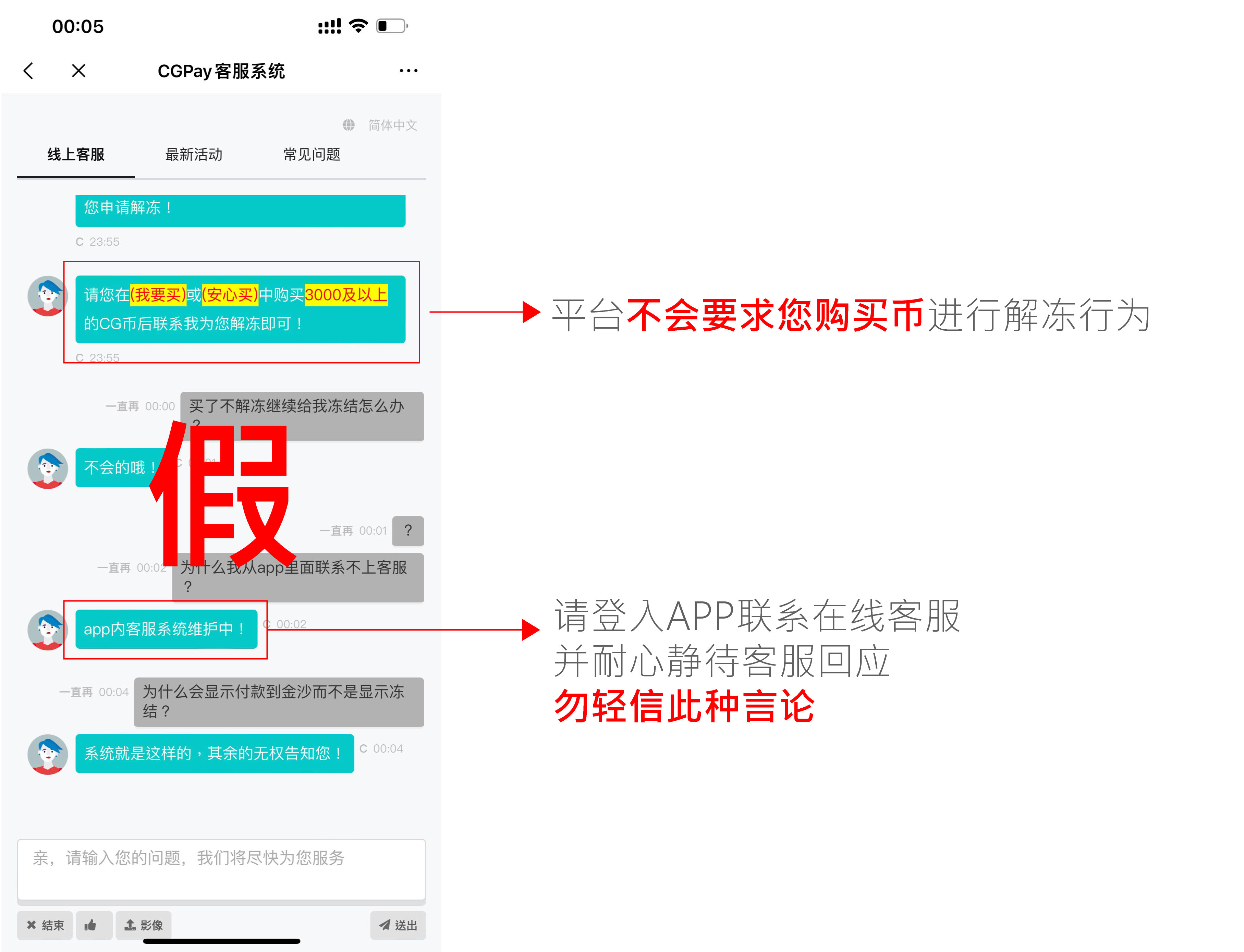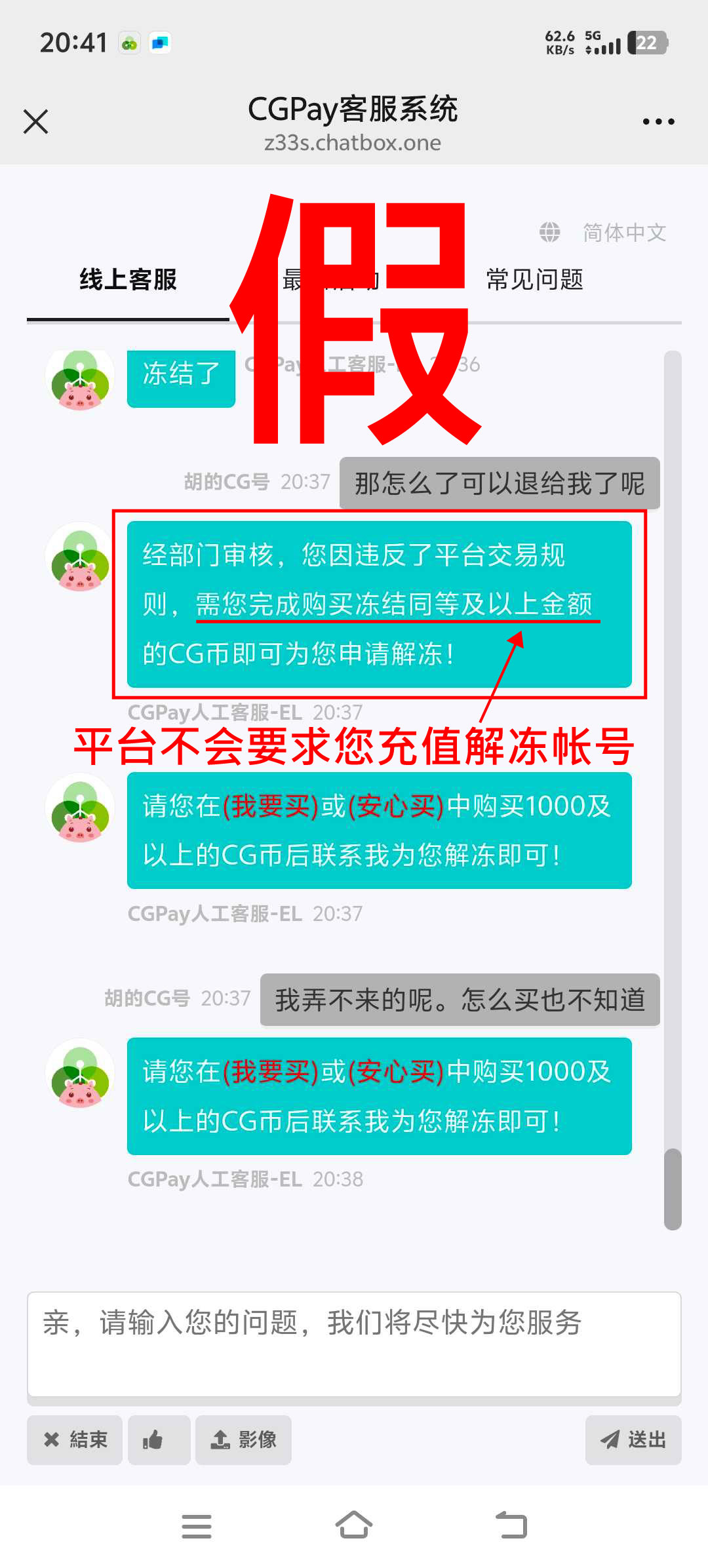 以上皆是常见的假客服、真盗分情境,看到勿慌,请直接打开APP联系在线客服进行确认,CGPay不会私下利用微信、QQ、支付宝客服、邮件给您不明链接或是二维码给您扫描!更不会要求您提供保证金、安全防护码、CG Auth验证器(2FA验证)等个人资料!请谨记,若私下进行交易与对话,平台是无法帮您进行追溯及取回您的款项!