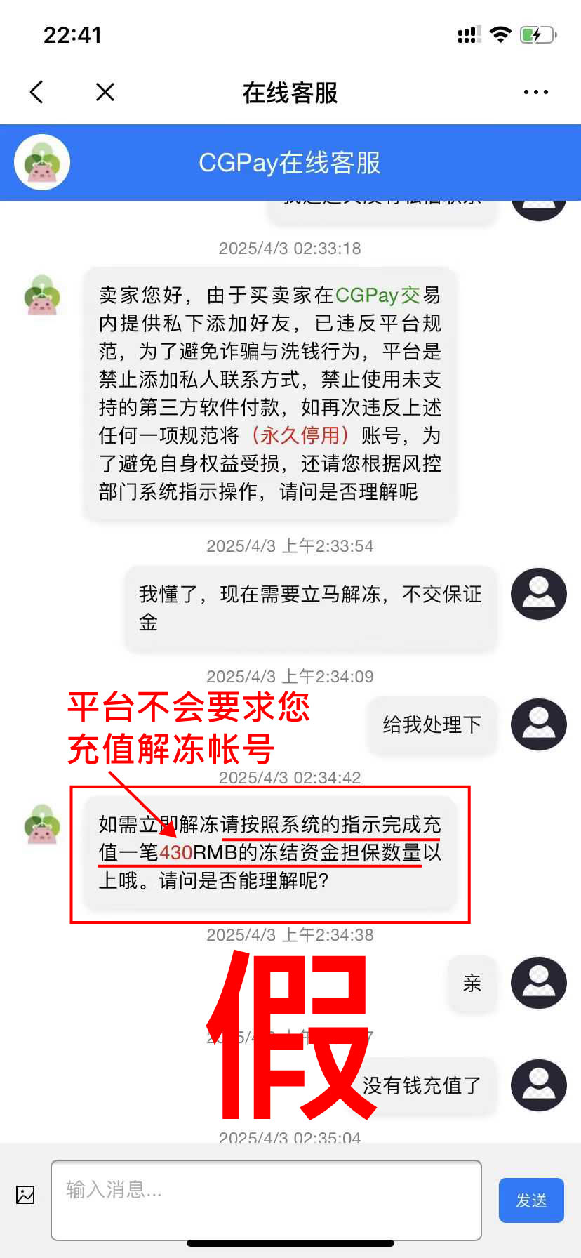 若遇到自称CGPay客服的来电或信息,对方要求进行私下交易或有诱骗您到其他平台买卖等无良行为,遇到这些情况,建议您直接进入APP里与线上客服询问,或是投诉微信/QQ/支付宝平台客服或直接检举该账号,切勿私下添加对方微信/QQ/支付宝等社交账户与他人进行交易。