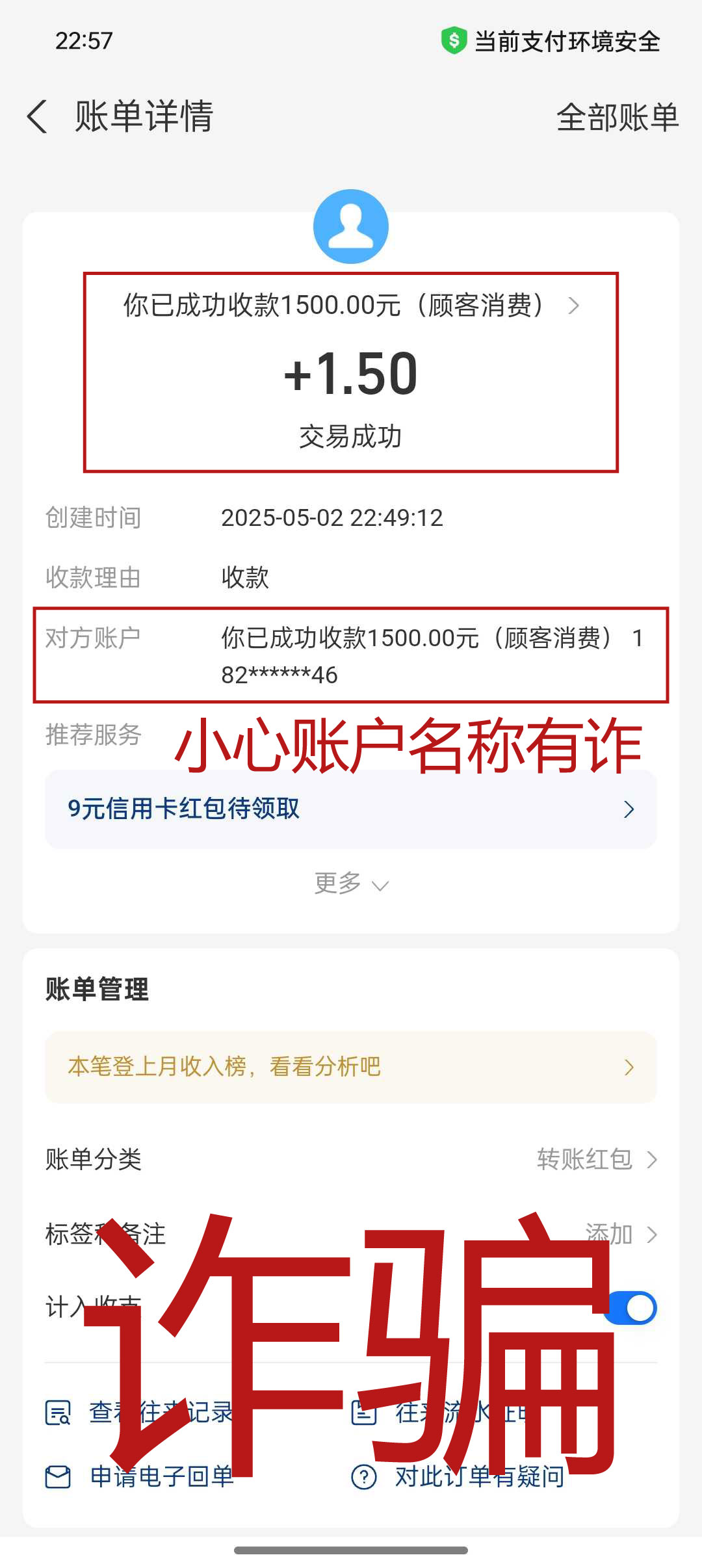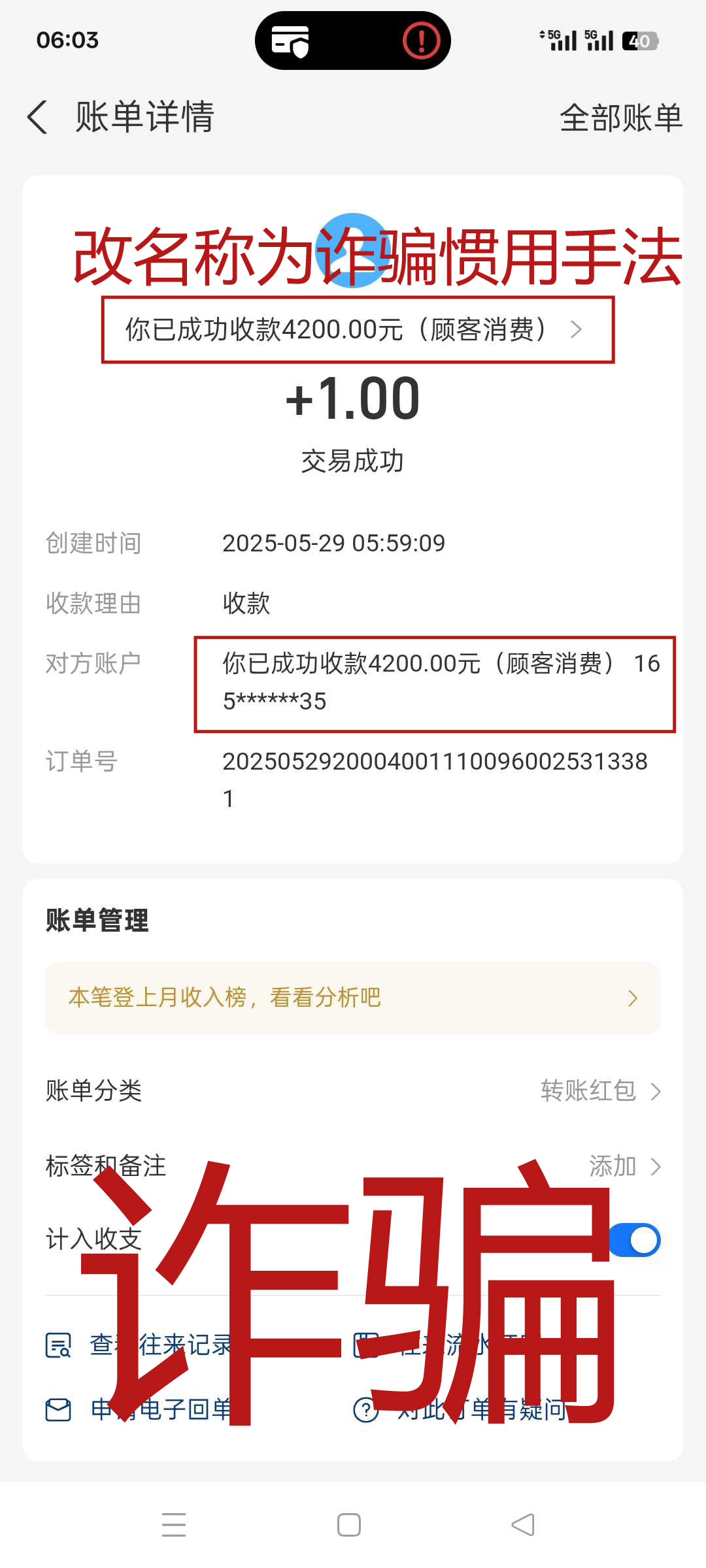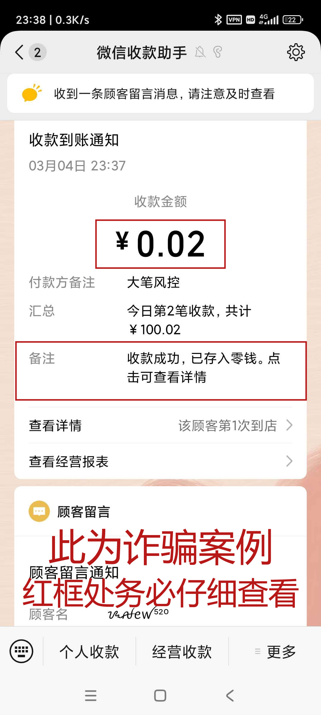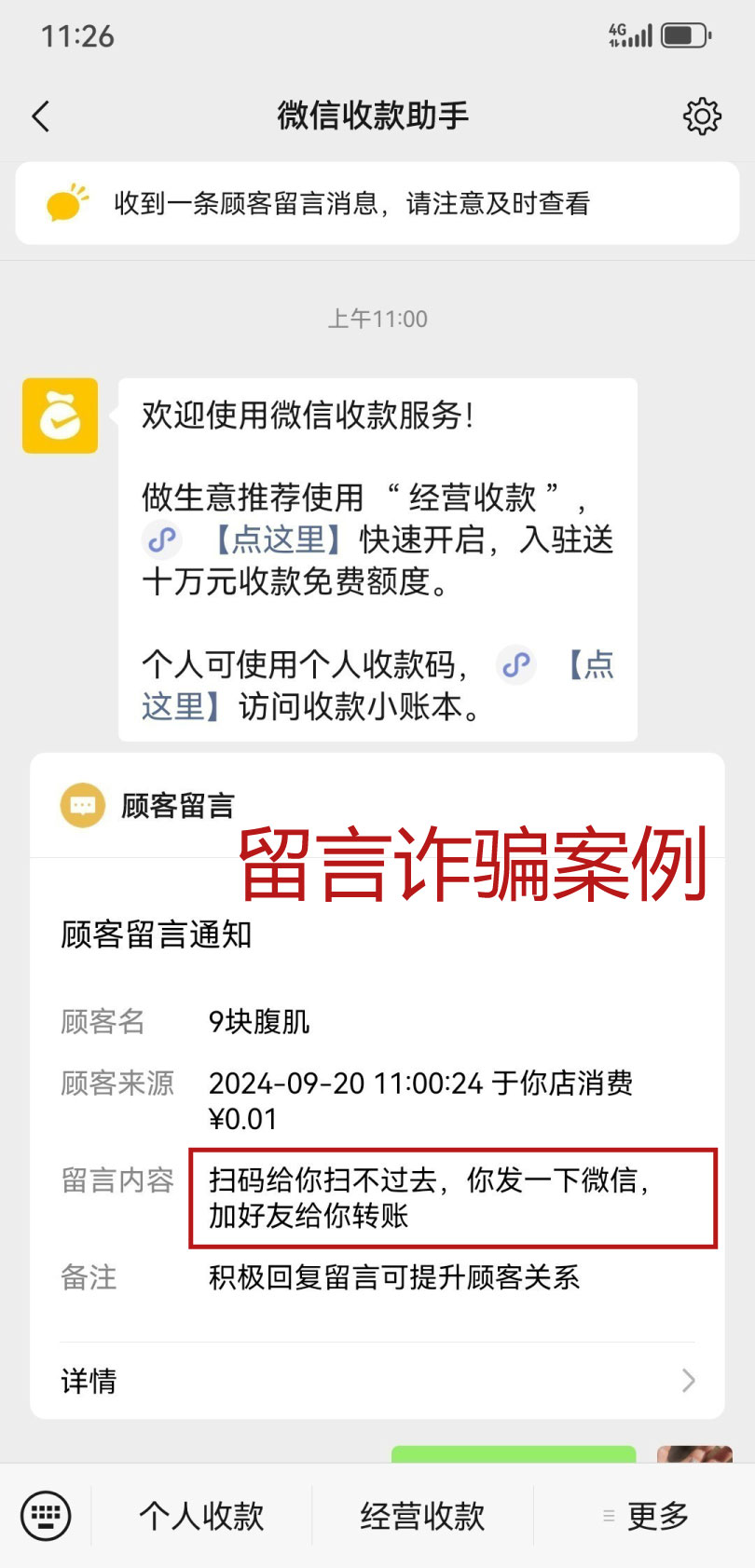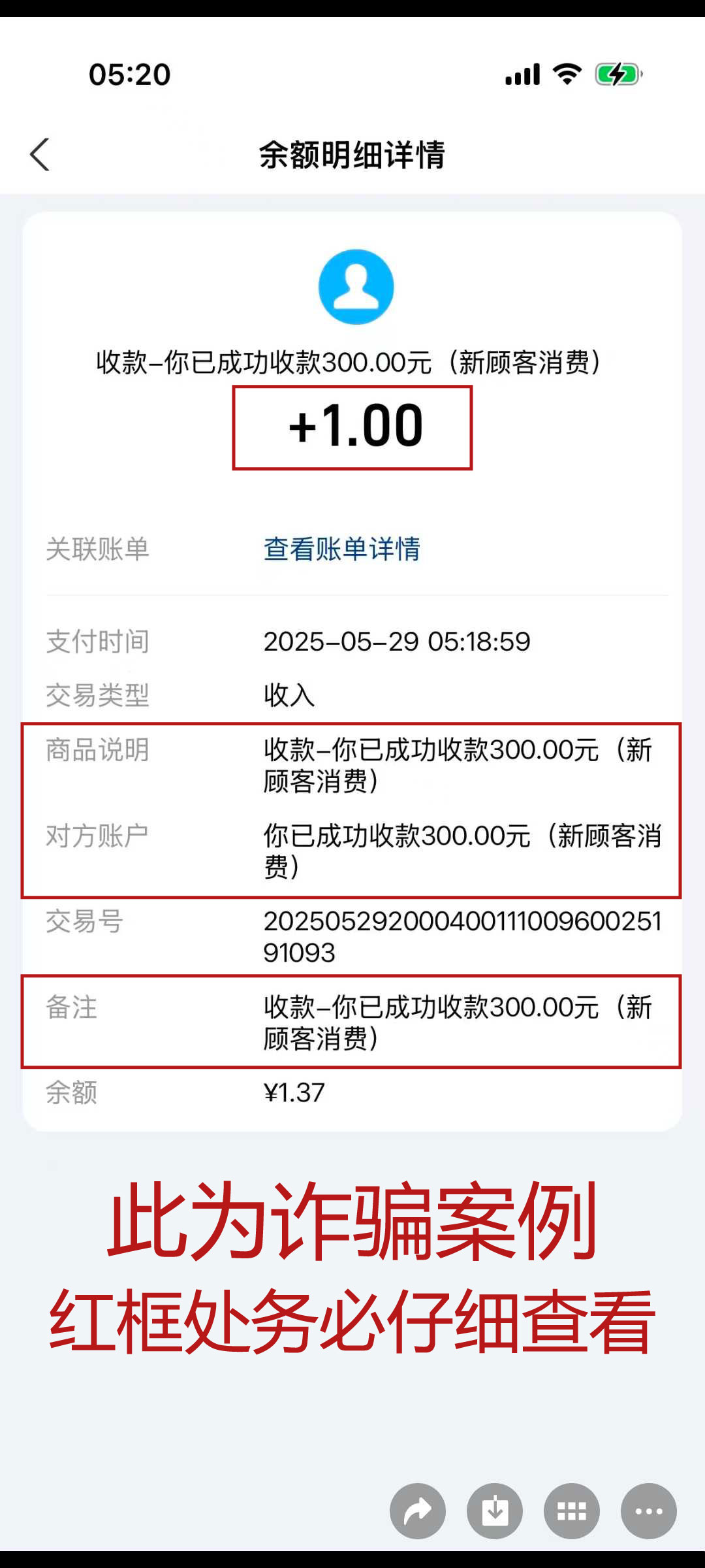 “交易金额“ 务必确认清楚,这才是到账后最应该核对的关键;而 “顾客名称“ 与 “备注“ 正是骗子最常用来欺骗受害者的手法。
