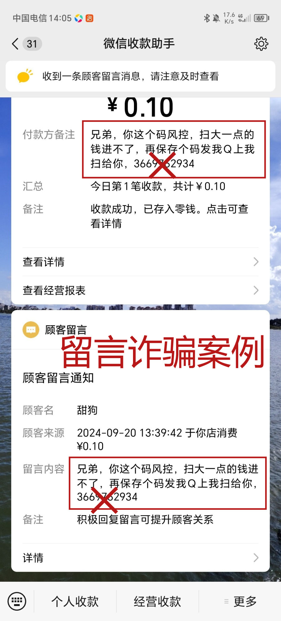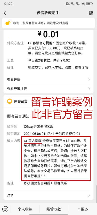 近期常见的诈骗套路包括:诈骗者先向受害者付款异常金额 (如0.01或0.02元),并在备注中表示 ”因风控所以大额扫不进”,同时提供微信号、QQ号等,要求卖方添加好友,或引导卖方主动提供联系方式。以上皆属骗子的手法。看到异常金额请立即提高警觉,这是诈骗惯用伎俩之一。