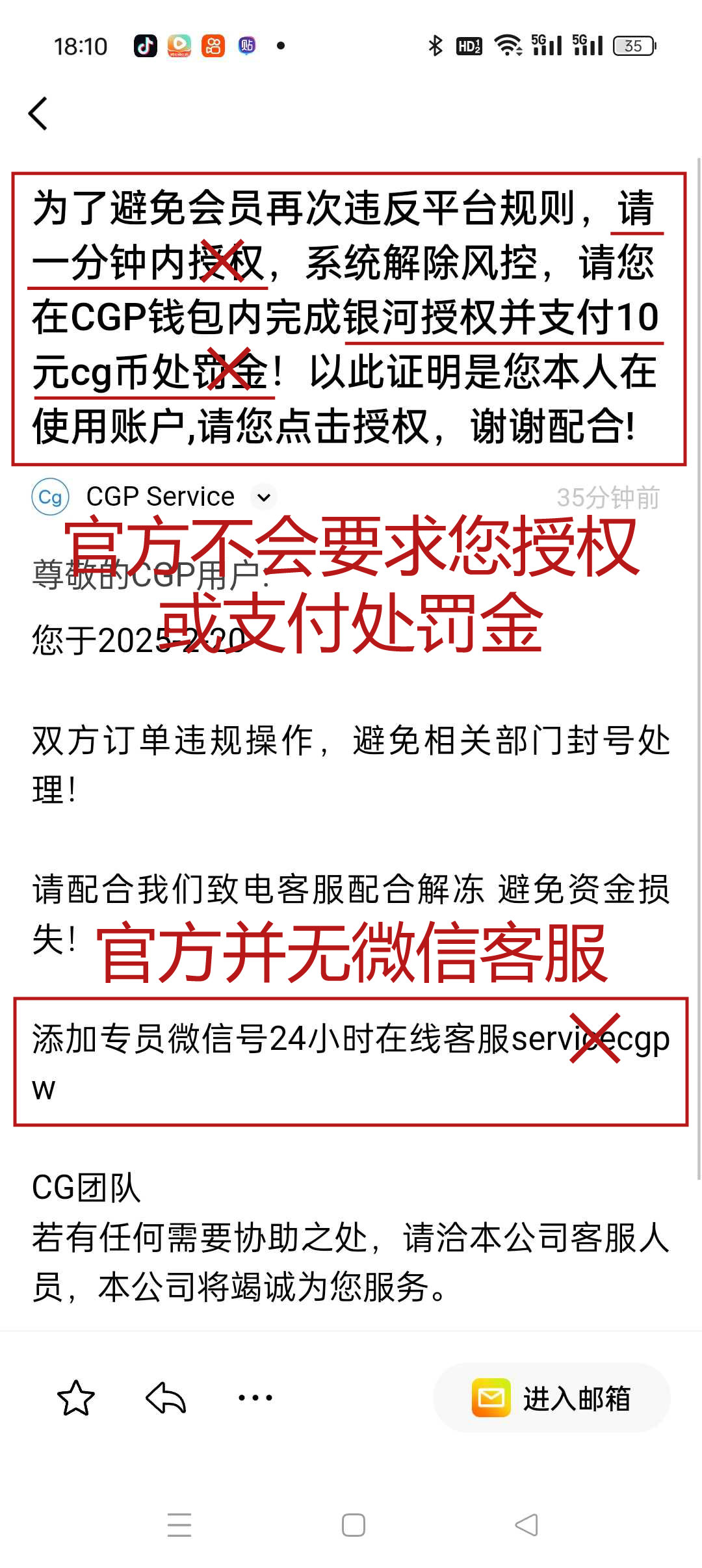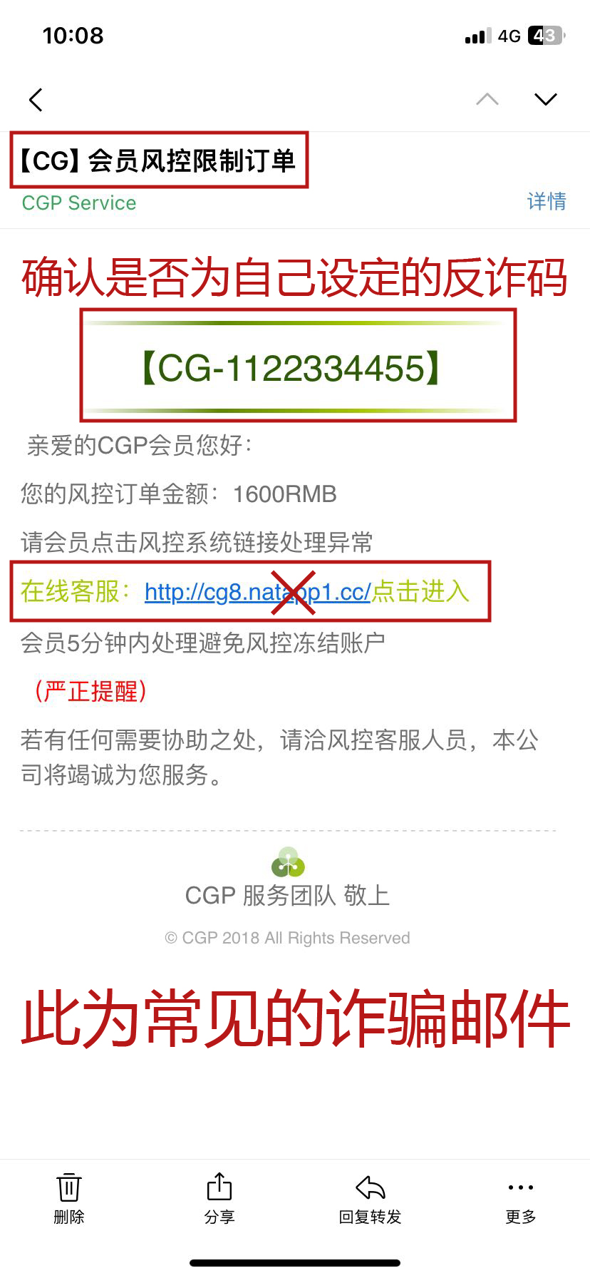 若您收到要求 “取消订单后请继续完成解除” 的邮件,或谎称 “账户被冻结”,并要求您向账户存入CG币,请直接忽略,也不要点击任何链接,更切勿回复对方任何个人信息。