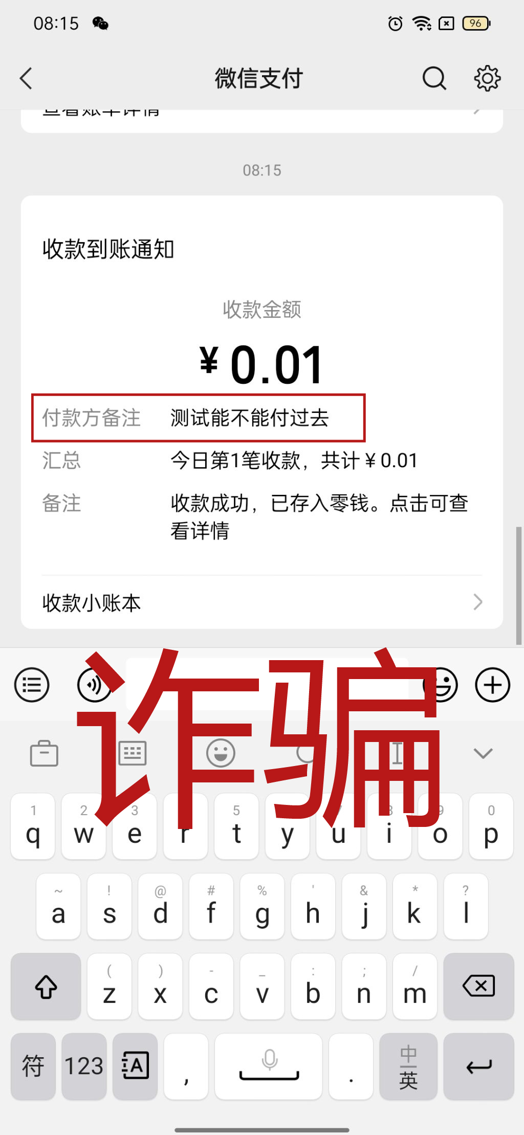 1.测试用0.01:诈骗者在“备注”中打上“测试能不能打过去”等类似措辞,以取信受害者,甚至谎称为钱包测试功能。然而钱包并无此功能。