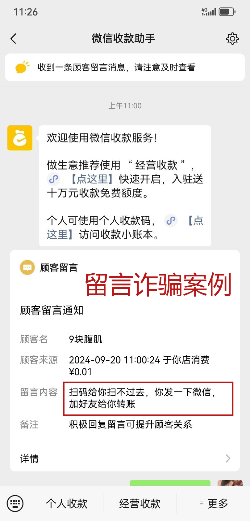 3.备注留言:诈骗者先付款异常金额(如0.01元)给受害者,并在备注中表示 “因风控问题,大额扫不进”,同时提供微信号、QQ号等,要求卖方添加好友,或诱导卖方主动提供联系方式。